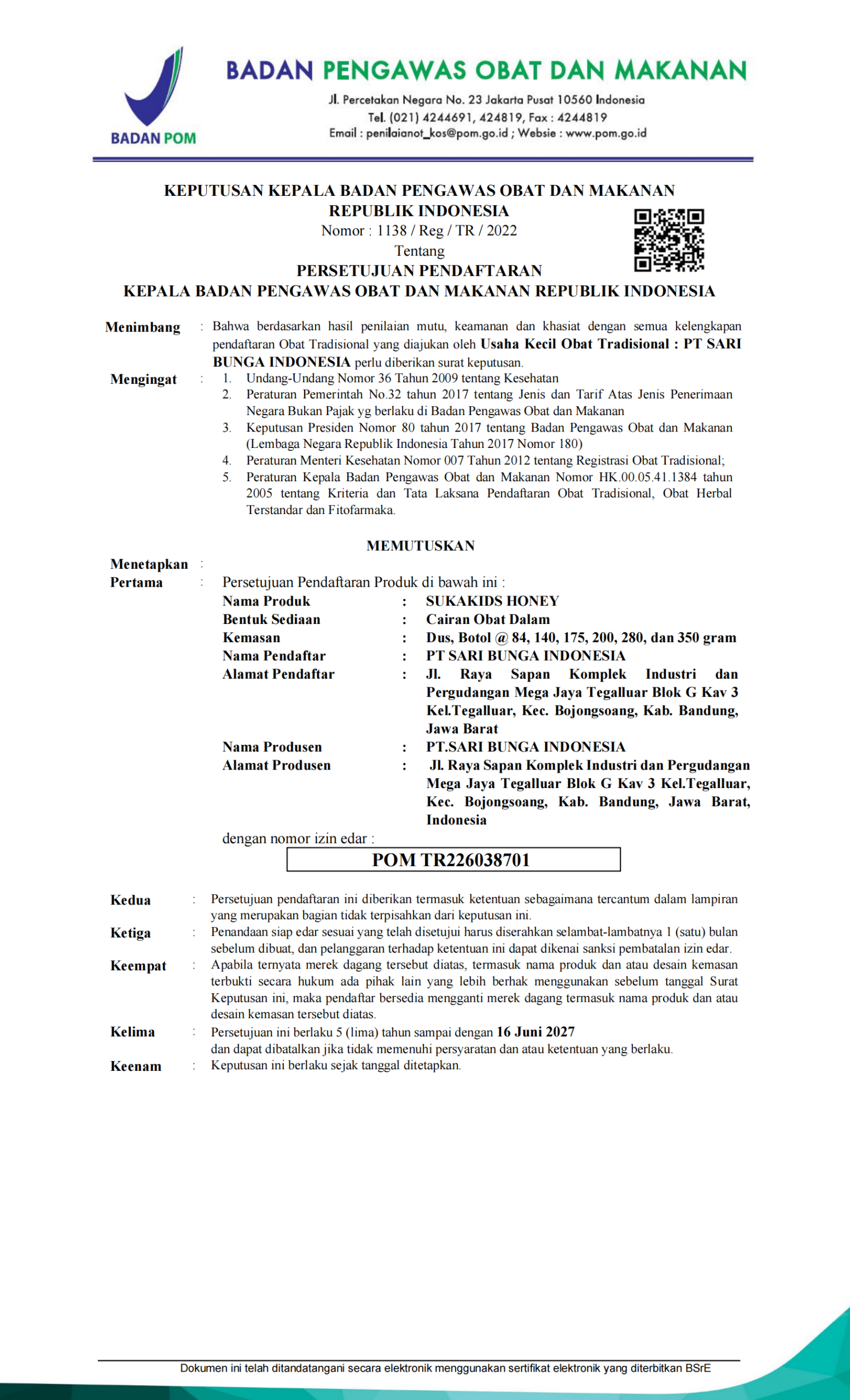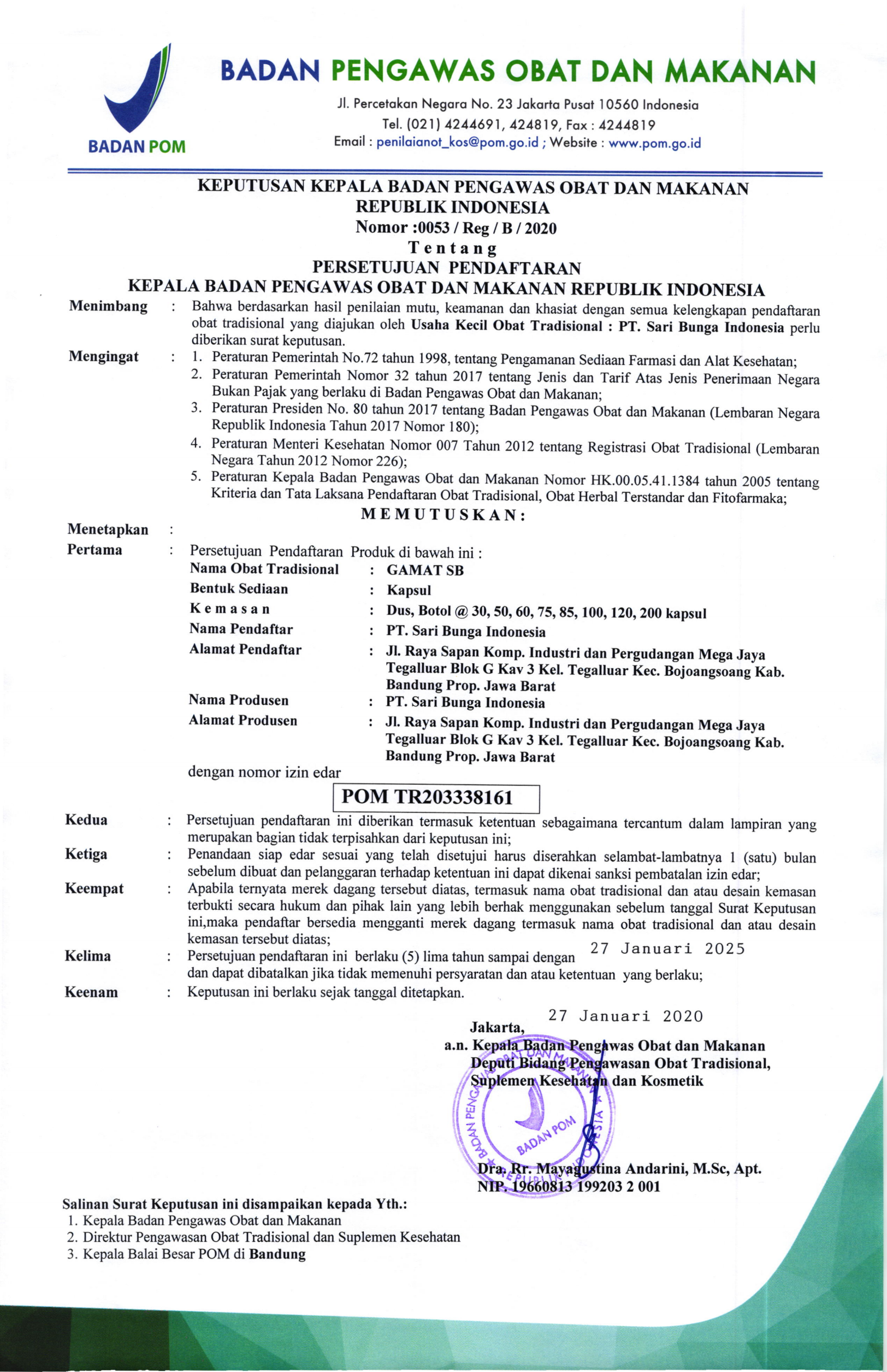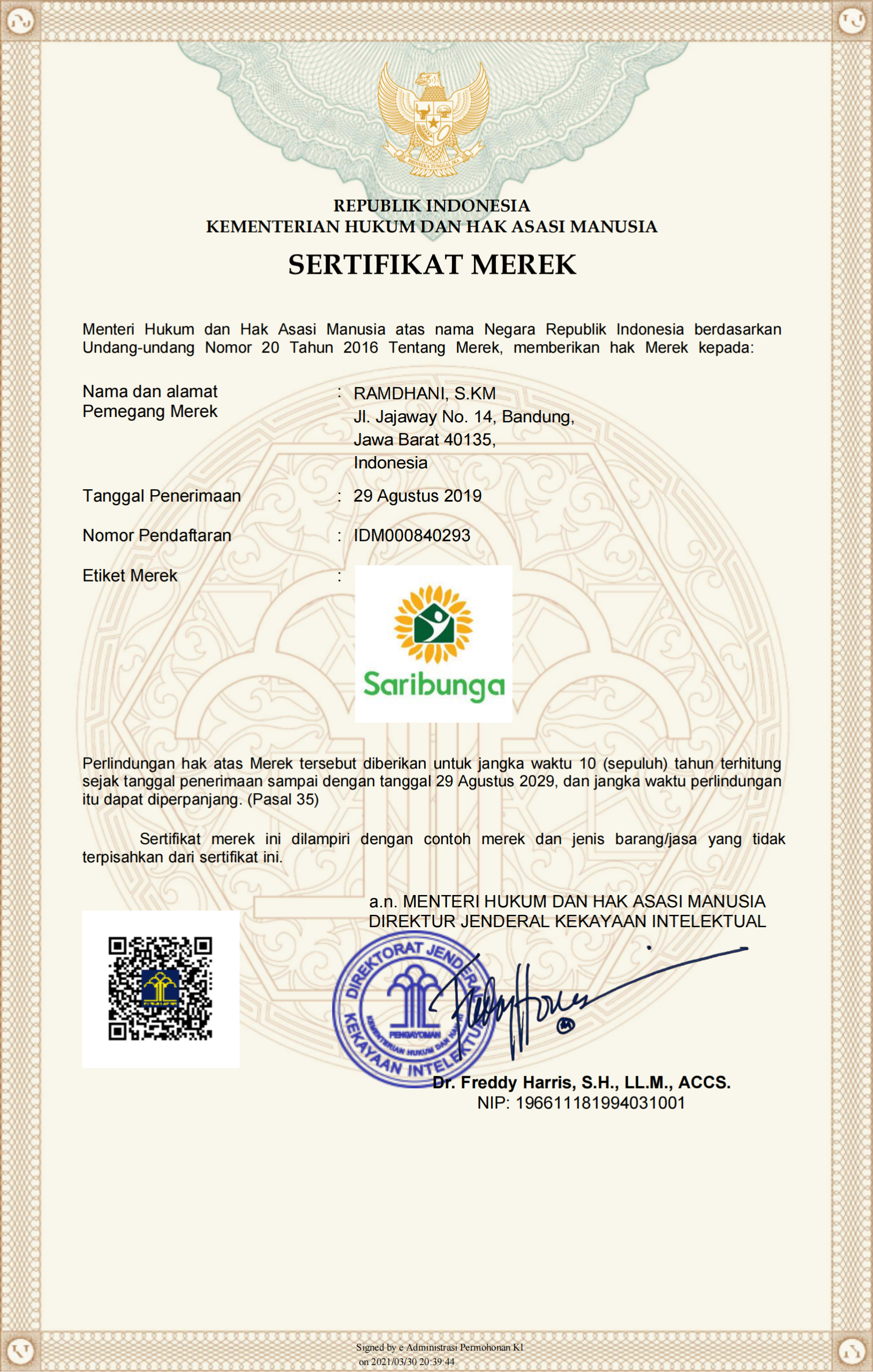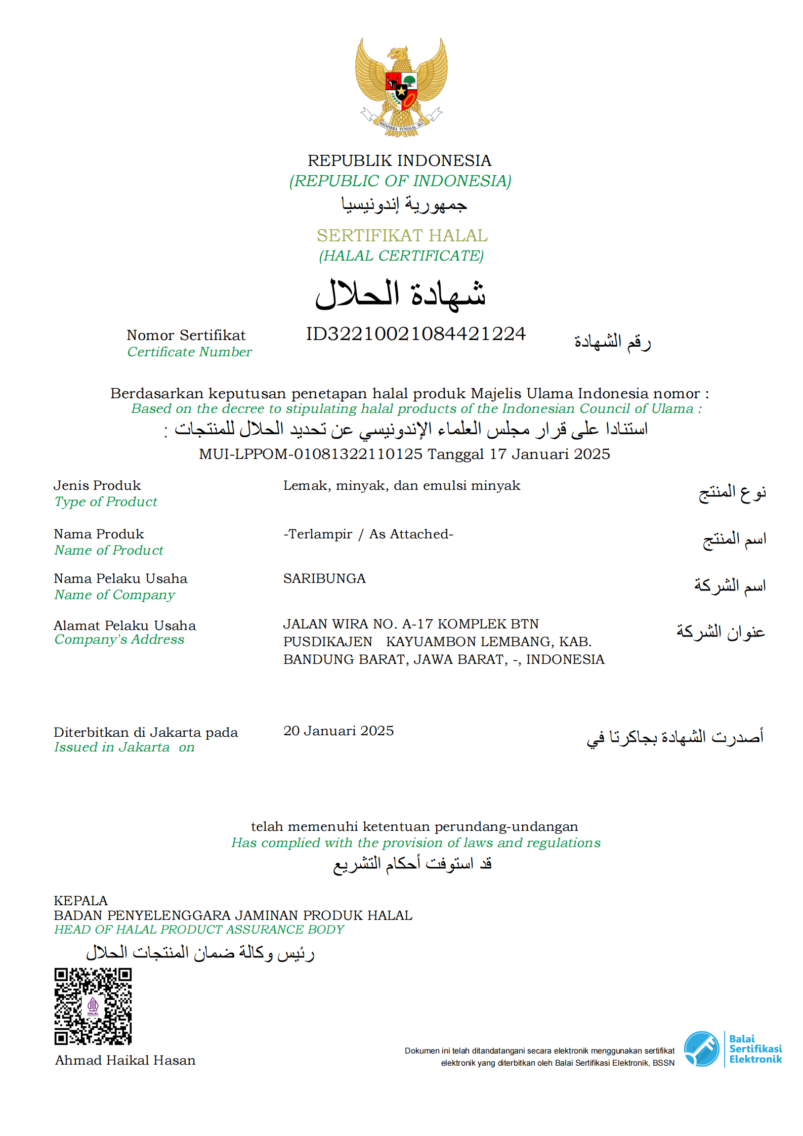 Dengan komitmen terhadap mutu, legalitas, dan keberkahan, kami berupaya memastikan setiap produk Saribunga tidak hanya aman dan berkualitas, tetapi juga membawa manfaat nyata bagi kesehatan masyarakat serta mendukung kelestarian alam.